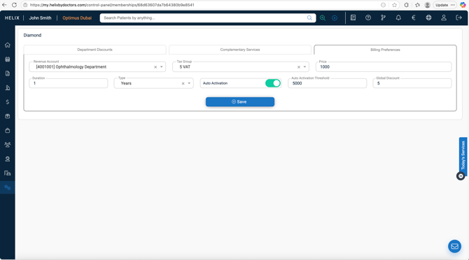 Global Discount % – optional blanket discount for all services availed by enrolled members, not specific to any department type.