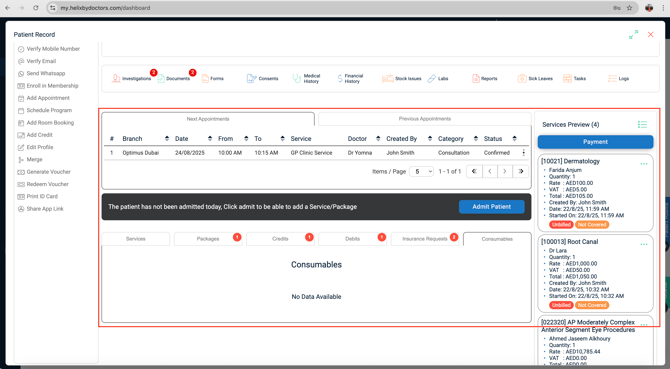 The Services & Billing panel is at the bottom‑centre of the Patient File. It powers service addition, packages, consumables billing, insurance requests, credits, debits, and membership visibility.