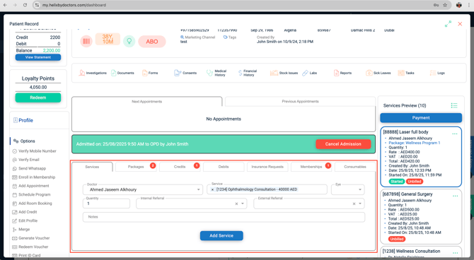 Add Service – Appears only after admission and only if reception chose No in the admission pop‑up. Disappears once clicked. It copies the original booked service into the current visit under the same doctor.