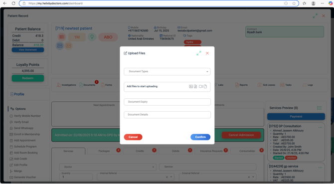 Click '+' button and. Add type(e.g., X‑ray, CT, MRI, Laboratory) and speciality. - In the patient file, click Investigations → Upload.