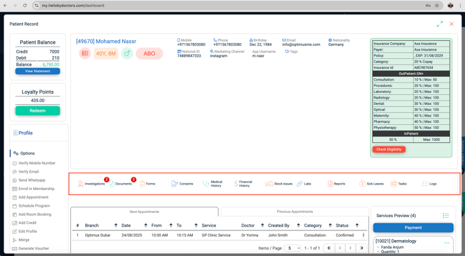 There are multiple buttons at the central section of the patient file that lets you do the following actions: